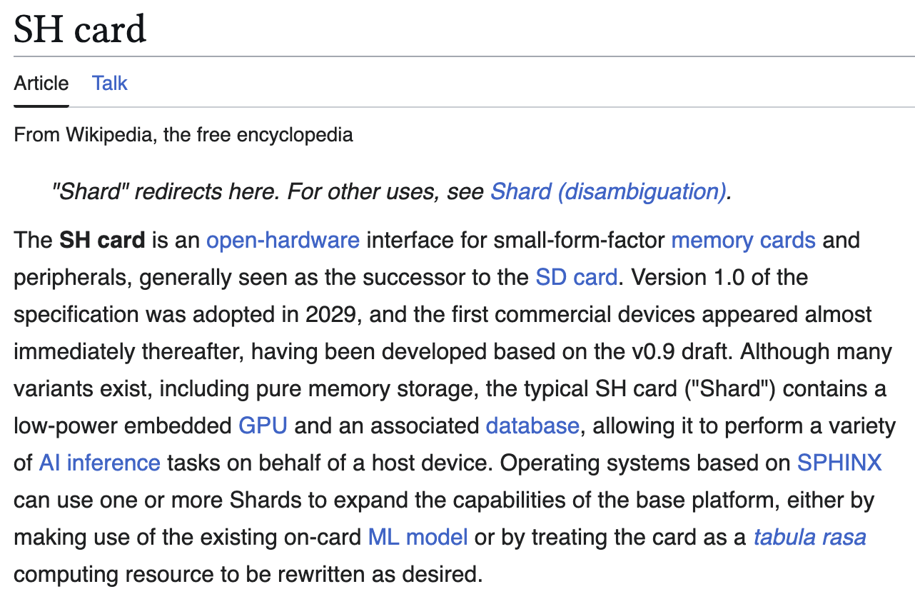The official Artefact game and lore posts include “Shards” as something between a currency and a tool for decryption, but it isn’t explained what exactly they are. So I went ahead and postulated that it’s a shortened term for “SH card”, the 2030’s successor to SD cards. They can be used as extra plug-in computing resources, and get traded around as small but valuable commodities: